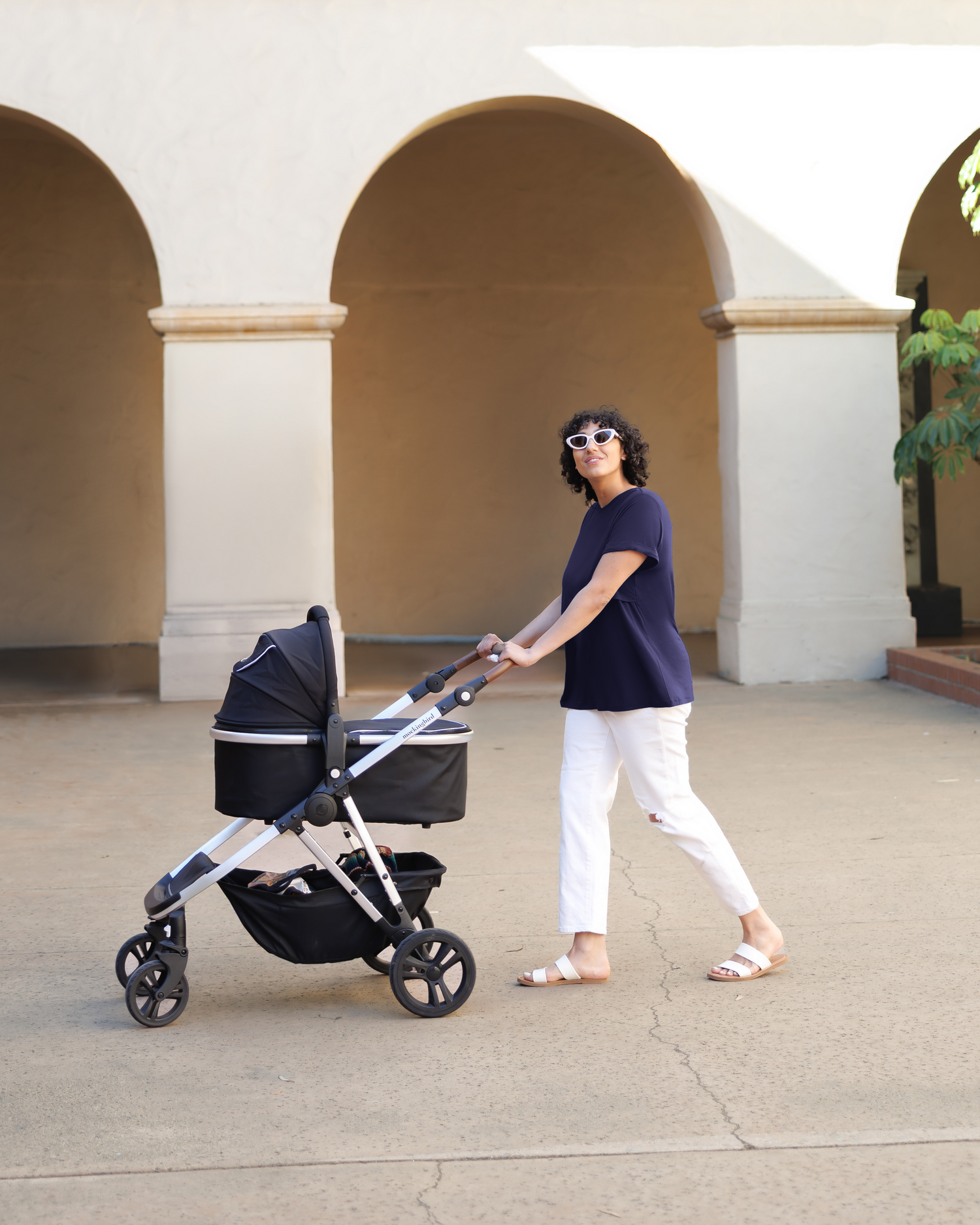 The staple nursing tee you need for spring and summer! This super-soft, breastfeeding-friendly shirt has a relaxed drape and discreet nursing panel - ideal for feeding on the go. For breastfeeding access, lift up the asymmetrical nursing panel and pull aside the inner V-neck layer. With a modern fit, flattering crew neckline, and decorative cuffs, this short-sleeve nursing shirt pairs perfectly with jeans, joggers, or leggings.