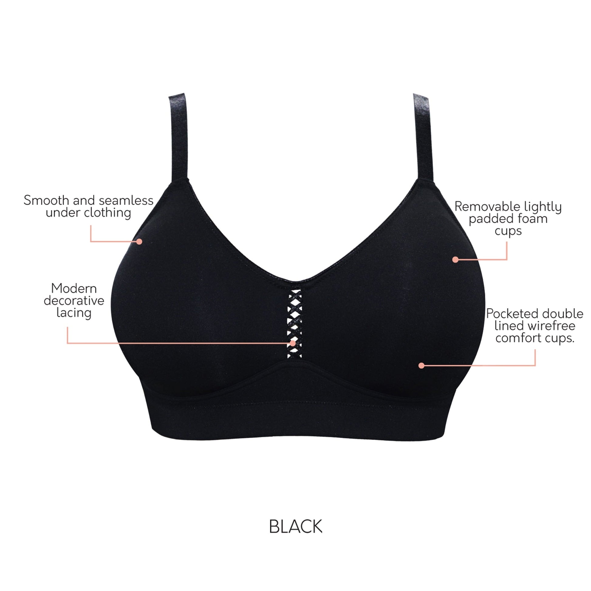 Comfy yet supportive, this seamless wire free bralette looks and feels perfectly smooth under clothing. The soft double lined cups include a pocket with versatile removable thin foam cups for better support and shaping based on your preference.