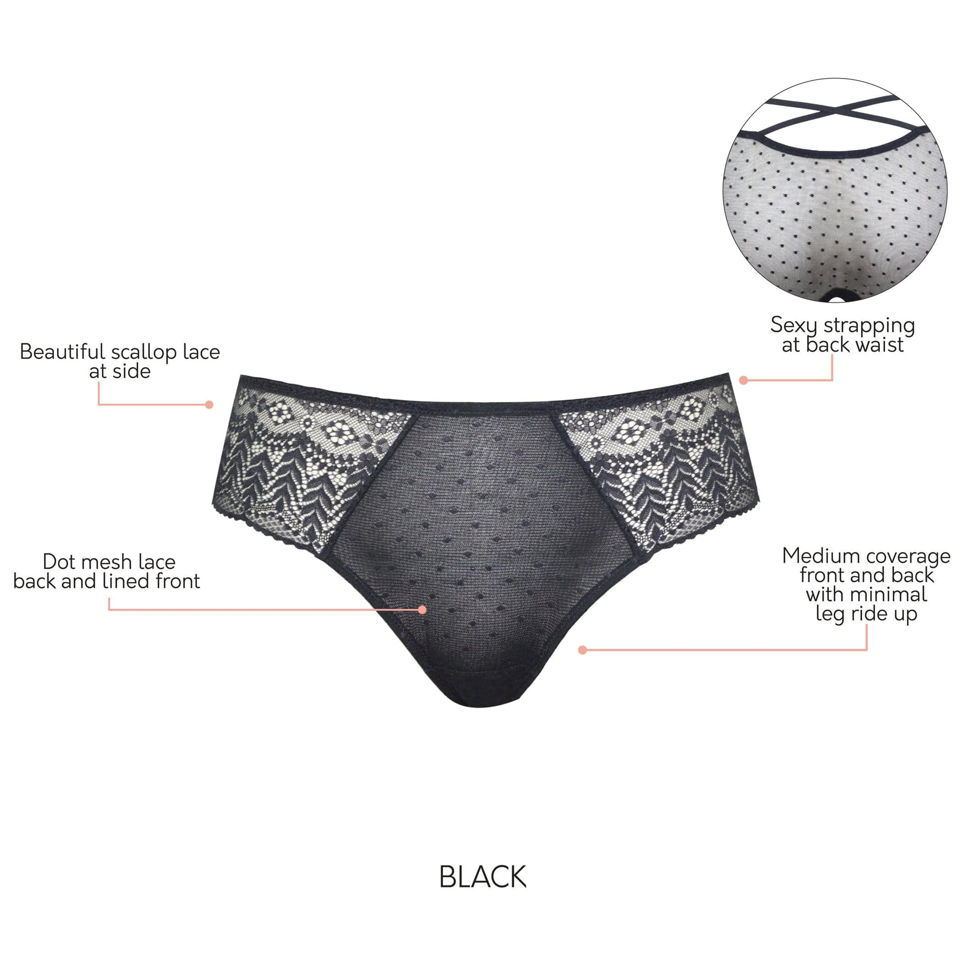 This highly-requested new style pairs with our best selling Mia Dot Bralette and Mia Lace Bralette & Chemise. With medium coverage and minimal leg ride-up, our Mia Hipster has dot mesh at the front and back, lace at the side and mesh at the center front. To match our bralettes and chemise, this panty has cross straps at the back to add a sexy feel.