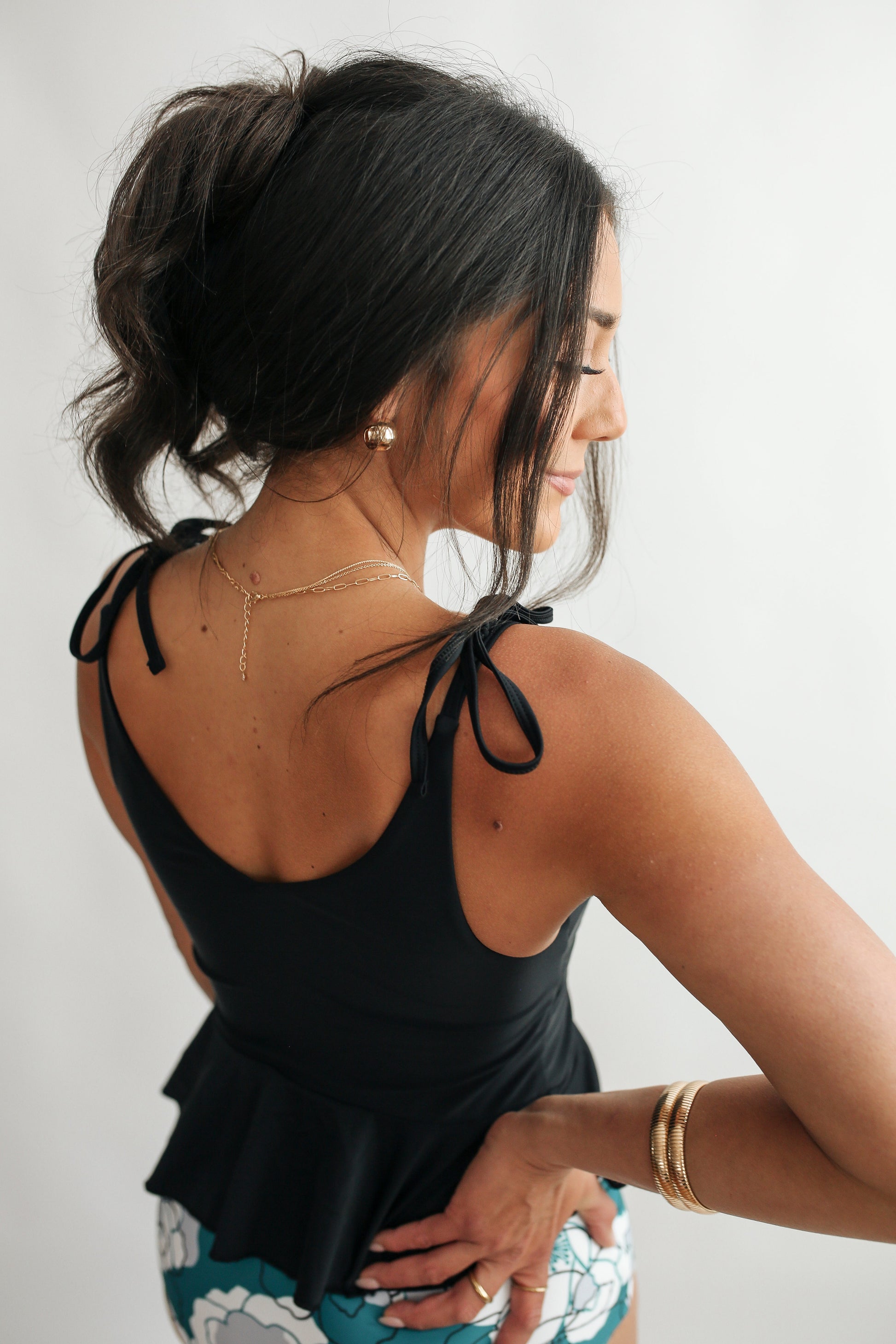 The chic peplum design gracefully flares at the waist, providing a comfortable and flattering fit for all body types. The stylish tie shoulder straps add a touch of elegance and allow for adjustable support.